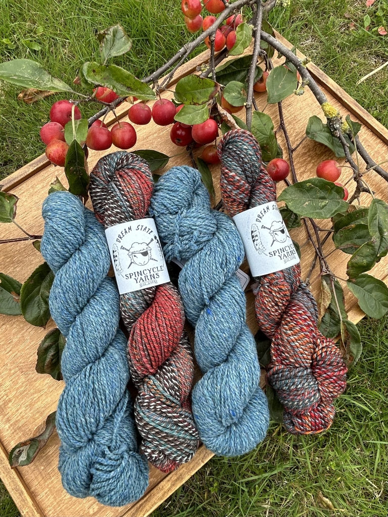 - Castaway blues: Spincycle Dreamstate in Castaway & Green Mountain Spinnery Mewesic in Blue Bayou